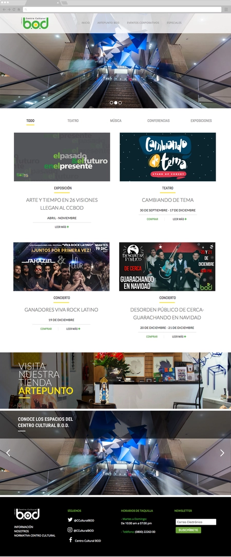 Since 2014, we have worked on different projects with Centro Cultural B.O.D., including digital communications and the development of their web portal. Recently, we have modernized their website with the goal of simplifying the billboard of more than 25 weekly functions.