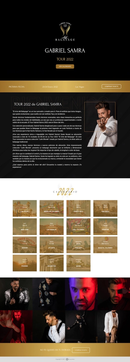 Today we present our most recent web work. A landing page designed to promote and showcase the upcoming events of the 2022 tour by renowned international stylist Gabriel Samra. The web design was handled by our Web Designer Daniela Rodriguez. This landing page features an initial animation with the tour logo, followed by a description of the event and Gabriel Samra. The calendar presents upcoming dates at different locations with all necessary information in a modal.